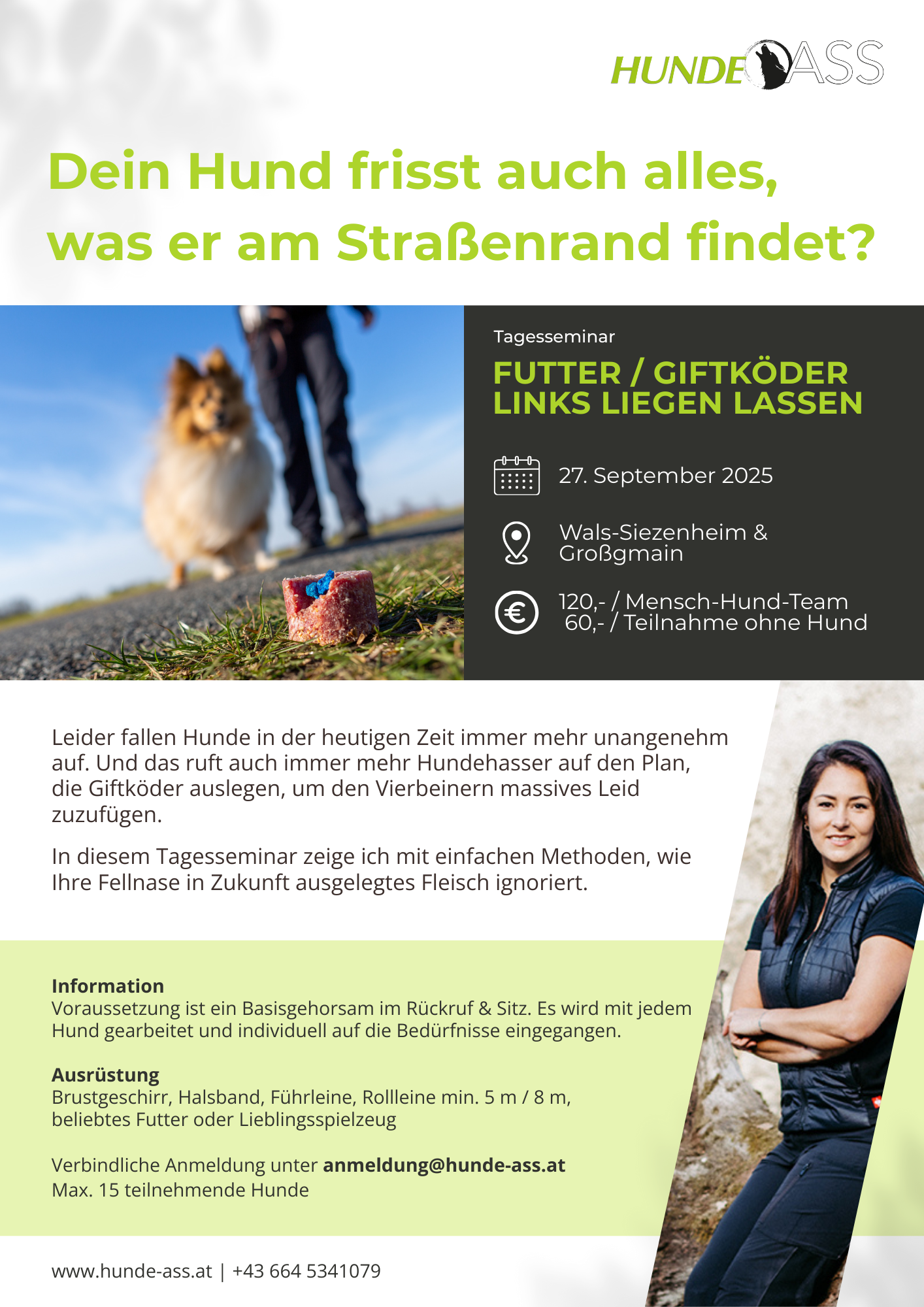 In diesem Tagesseminar zeige ich mit einfachen Methoden in Theorie und Praxis, wie Ihre Fellnase in Zukunft ausgelegtes Fleisch ignoriert.